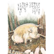 子豚たちが楽しそうに、あわててエサを食べている。それを見た母豚が心の中でつぶやきます。